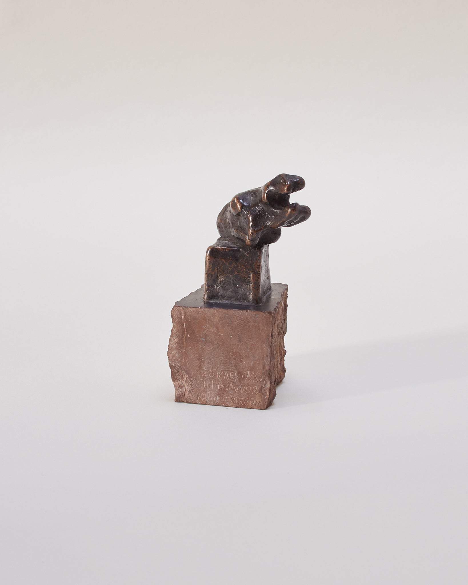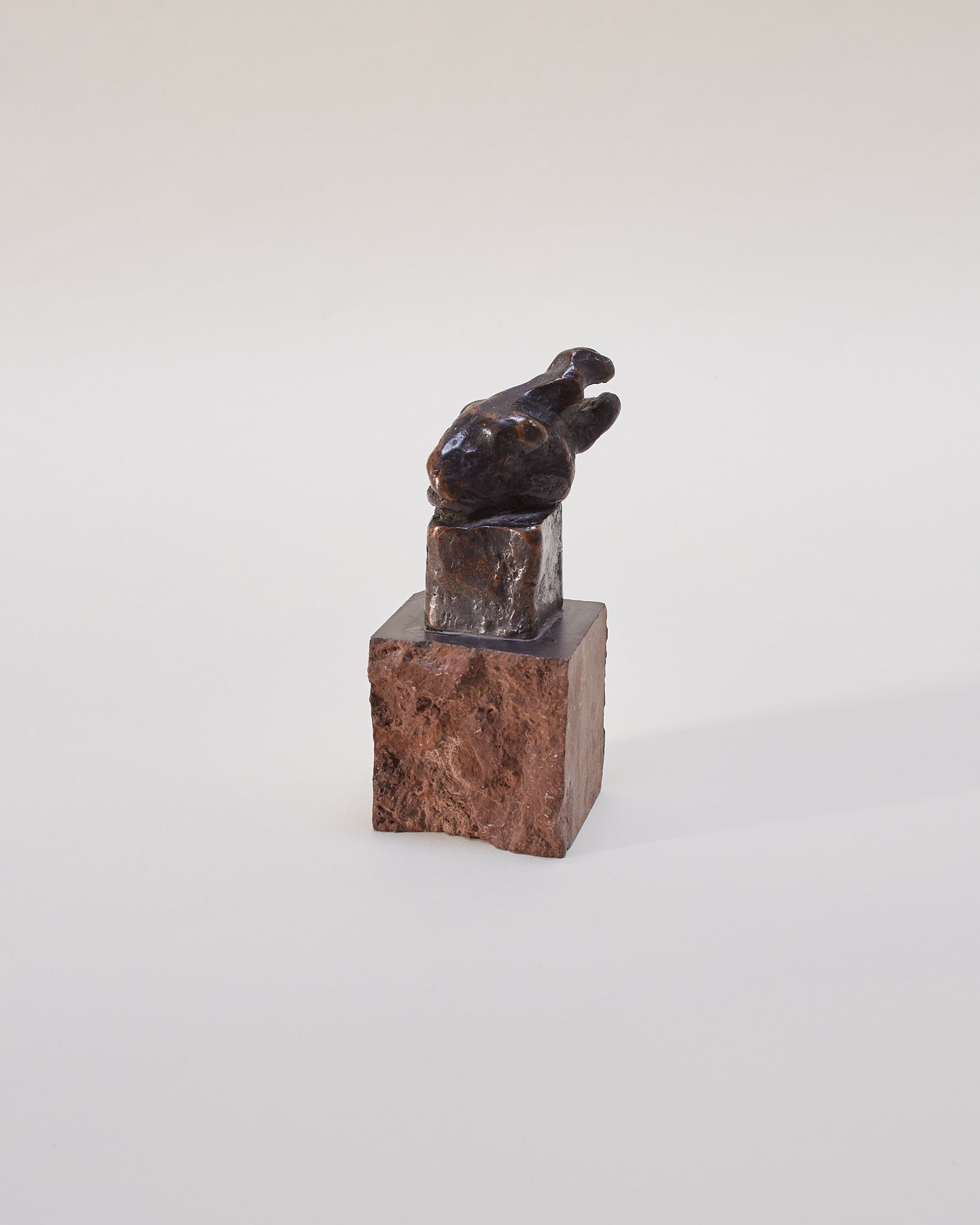Small but remarkably striking and tactile — dark aged bronze contrasting smooth and rough stone, crudely hand-etched with the artist’s attribution.