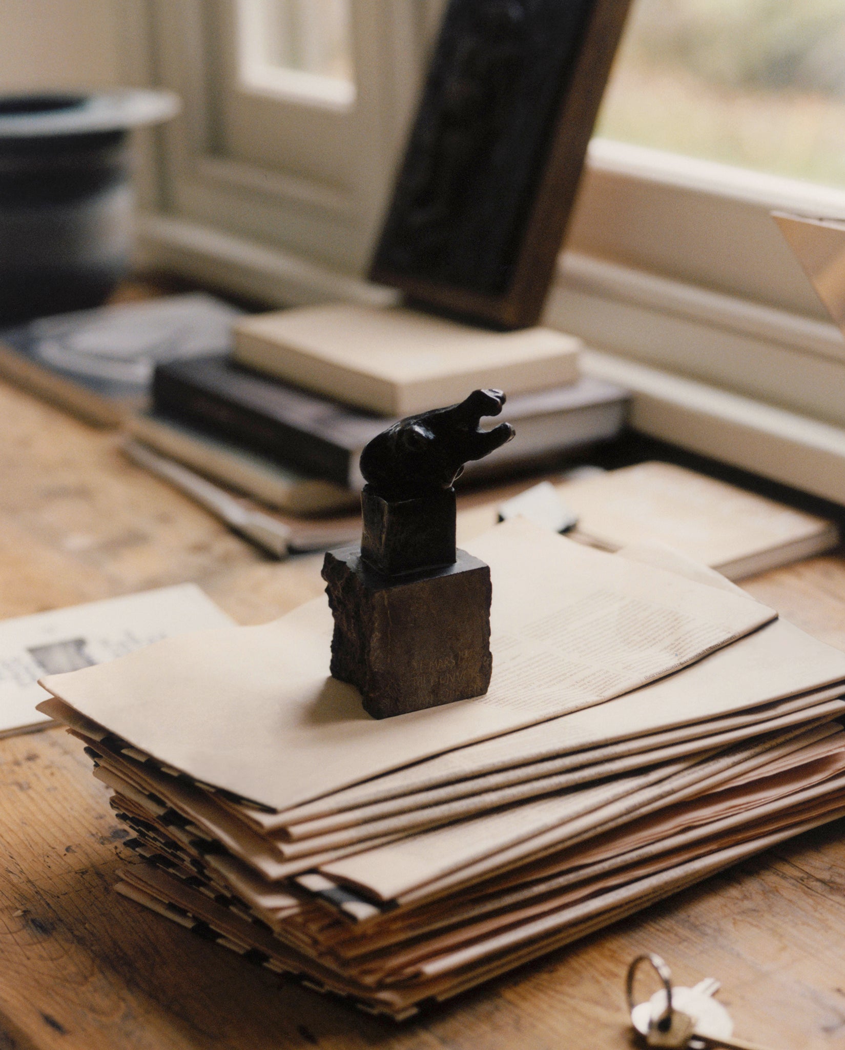An abstracted horse head in bronze sits on a stone plinth — reminiscent of Henry Moore’s horse head studies.